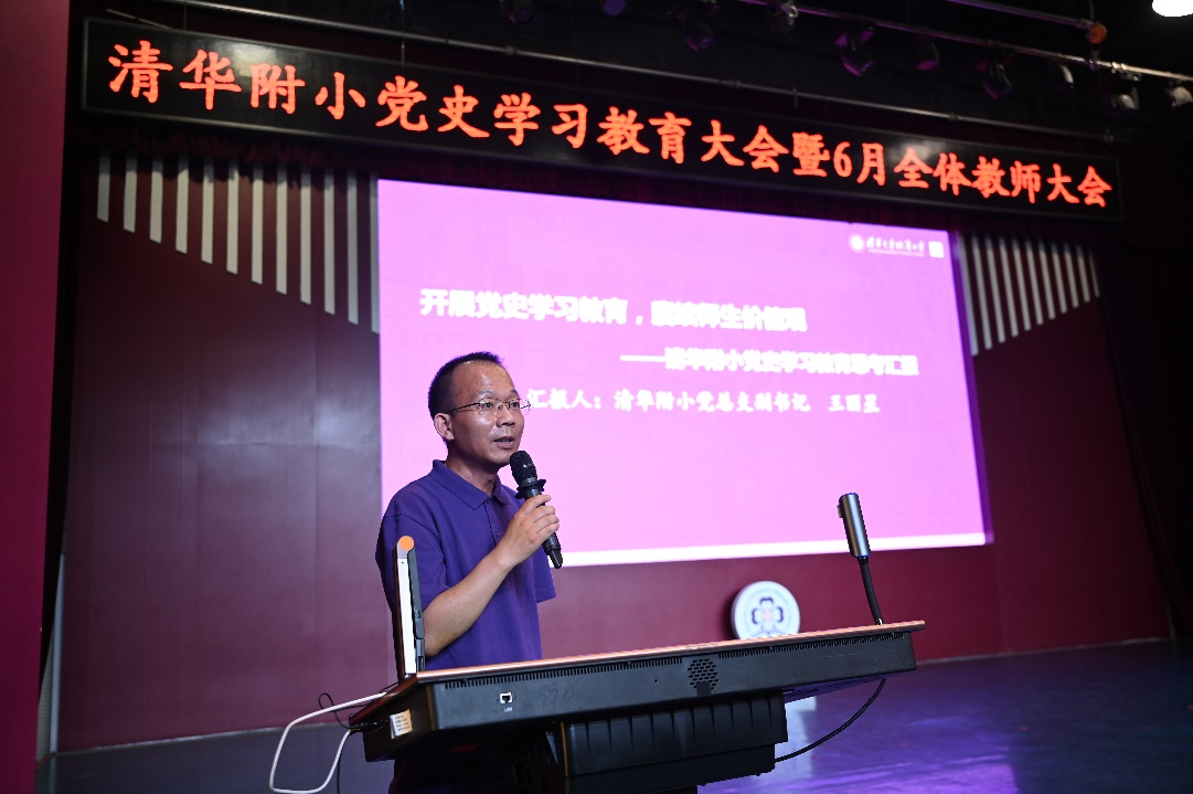 附小党总支副书记王丽星汇报了清华附小党史学习教育的阶段性进展,在不断创新党史学习的方式中,学习党的光荣传统、优良作风和坚定的理想信念,始终坚持问题导向和实事求是的工作作风,把党建工作做实、做细、做好,扎实推进党史教育走深、走实。党员教师、积极分子代表薛晨、李佳楠、王雨琪、刘丹,朱婧丹分别从语文、思政、美术、音乐、数学等学科角度汇报了该学科如何落实党史学习教育要求,以教材为学习的源头,以课堂为主阵地,将学党史与学科教学相融合,把红色种子种在成志少年心中。