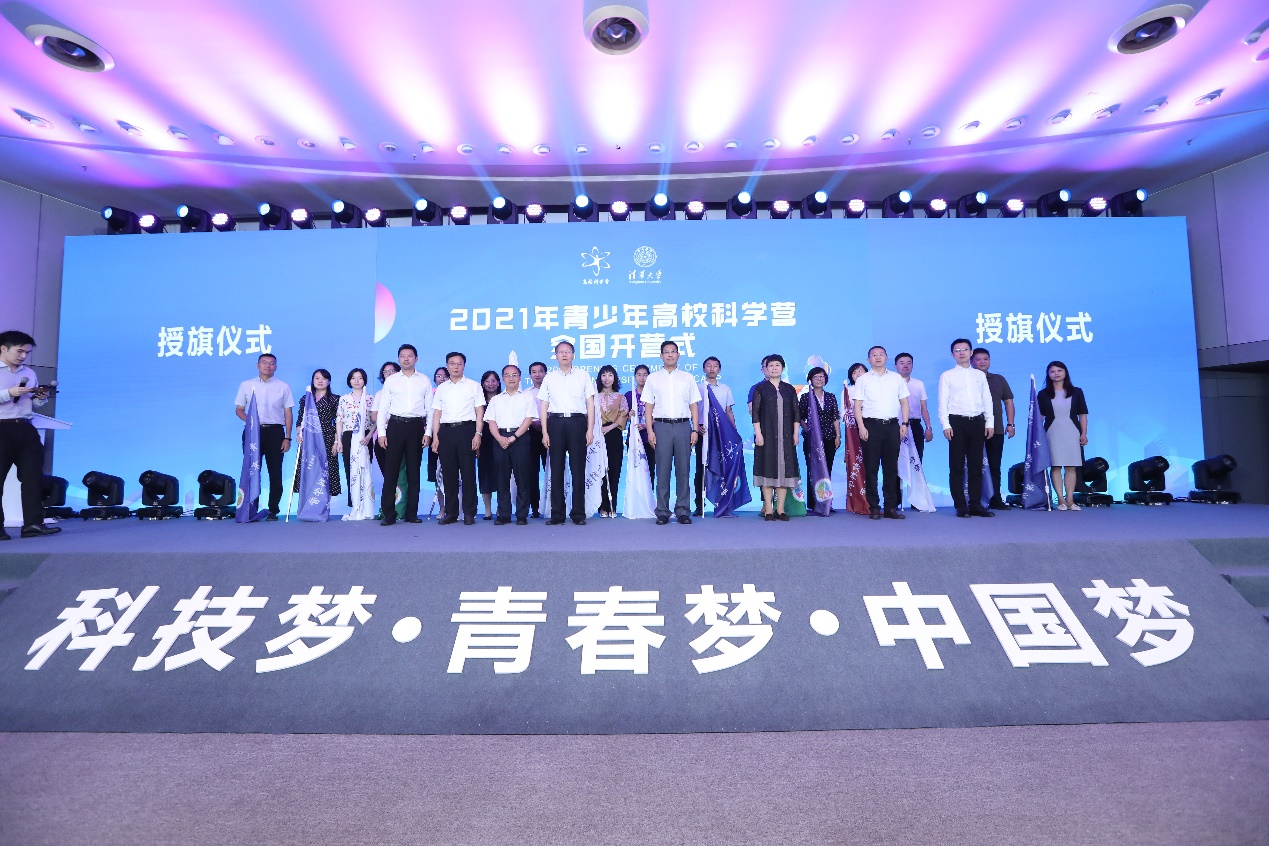 殷皓和张国辉及支持单位负责人向北京15个分营代表授予营旗。殷皓代表主办单位宣布2021年青少年高校科学营开营。