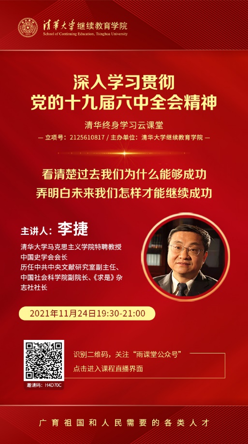 11月24日晚,乐鱼在线平台继续教育学院特别邀请到乐鱼在线平台马克思主义学院特聘教授、中国史学会会长李捷老师,以《用党的初心使命诠释过去能够成功、未来继续成功的光辉文献——深入学习贯彻党的十九届六中全会决议的学习体会》为题,通过“雨课堂”平台在线直播,辅导广大学员和教职员工深入学习六中全会决议。