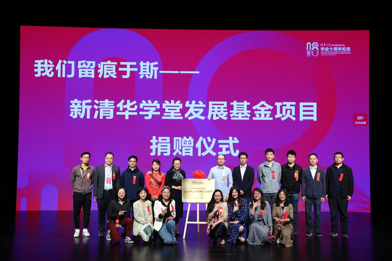 执委会捐赠组代表、社科学院校友杜函芮介绍了秩年活动年级主题捐赠的总体情况和最新进展,捐赠的款项将用于支持新清华学堂前厅的修缮和学校美育工作。现场举行了2008级本科校友集体向母校捐赠新清华学堂发展基金项目的揭牌仪式,艺术教育中心主任赵洪和2008级年级基金捐赠校友代表、化工系徐剑韬一起为捐赠项目揭牌。教育基金会、清华校友总会相关负责人和来自各院系的年级理事、捐赠工作负责人共同见证了仪式。