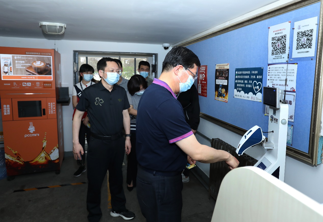 看到楼道里学生摆在宿舍门口的空桶装水瓶,邱勇立即问道:“封校后同学们购水、用水的问题解决了吗?”校团委书记余潇潇介绍道,目前学校已在校内学生宿舍区设置两座“清青供水站”,由乐鱼在线平台紫荆志愿者战疫“清”年突击队负责各水站的运维工作,同学们的日常饮用水需求已得到解决。