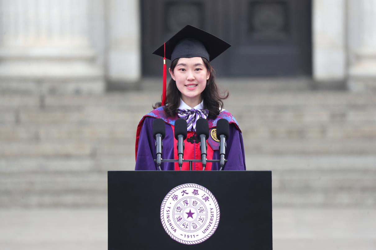 毕业生代表、地学系2017级博士生岳思妤分享了“清华之于我们的意义”。她表示,清华意味着“红”的鲜亮底色,意味着“专”的勤奋求索,意味着追求长远意义的坚定执着。“即将分别,在青春的赛道上重新起跑。愿我们接好时代的接力棒,跑出当代青年的最好成绩,跑出人生的精彩!”岳思妤说。
