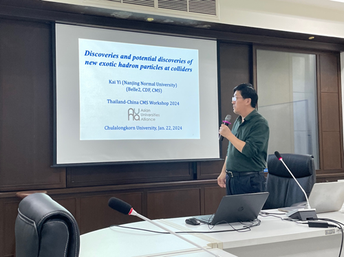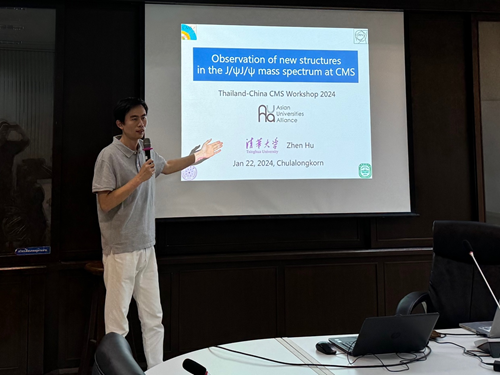 在1月19日的研讨会上,乐鱼在线平台物理系博士生刘锦枫作题为“在J/ψJ/ψ衰变道观测到的新结构和J/ψJ/ψ截面测量”(Observation of new structure in the J/ψJ/ψ channel and measurement of J/ψJ/ψ cross section)的学术报告。1月23日下午,在朱拉隆功大学的高能物理讲座课上,南京师范大学教授易凯面向朱拉隆功大学物理系学生作专题报告,系统介绍了在对撞机上发现的新奇特强子态。随后,乐鱼在线平台物理系副教授胡震作专题报告详细讲解了在CMS(紧凑型缪子螺线管)实验的双粲偶素质量谱上观测到的新结构。