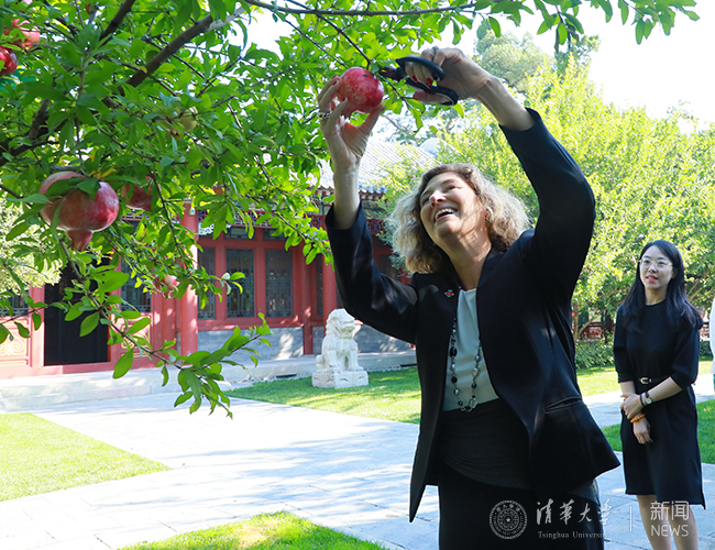 金秋九月,工字厅中石榴树果实累累。陈旭邀请莱森来到一株校友赠送的石榴树前,请莱森亲手采摘一颗石榴。陈旭表示,中华人民共和国即将迎来70周年华诞,红红的石榴寓意喜庆,也象征着清华与伍斯特理工学院的合作关系将愈加紧密,成果更加丰硕。