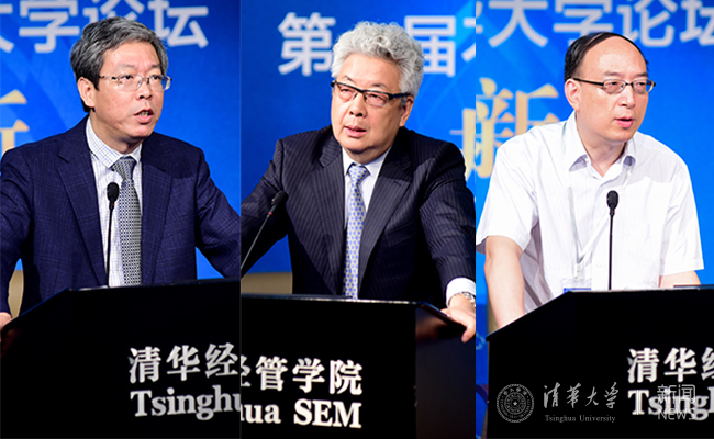 左起:清华经管学院党委书记高建、中国银行业协会研究部主任李健、中国拍卖行业协会副会长祁志峰先后致辞。