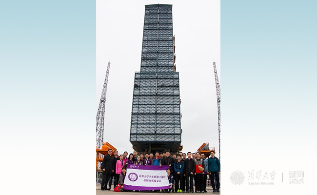 实践支队成员在文昌卫星发射中心发射塔架前合影。