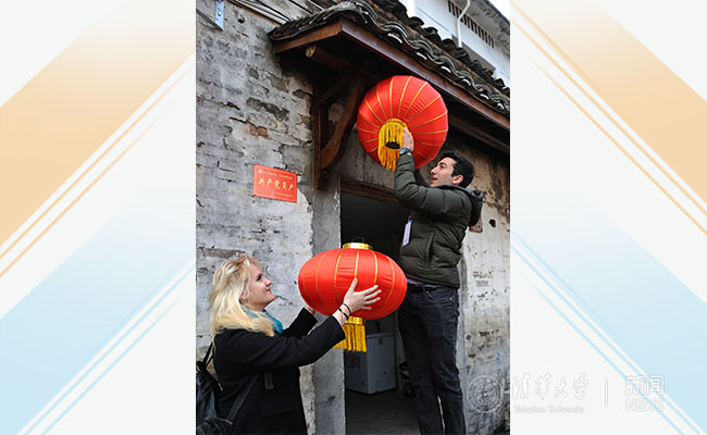 清华学子给自“家”门口挂上大红灯笼。朱谢旻 摄