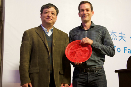 报告结束后,计算机系党委书记孙茂松代表计算机系向杰夫•迪恩赠送了清华纪念品。