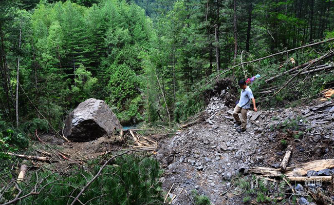 杨锐教授徒步考察灾区景观受损情况。