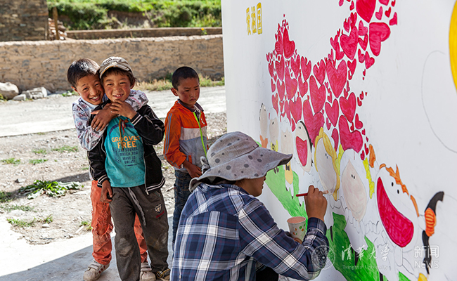四川支队利用安装设备之余装点学校墙壁。 张枢 摄