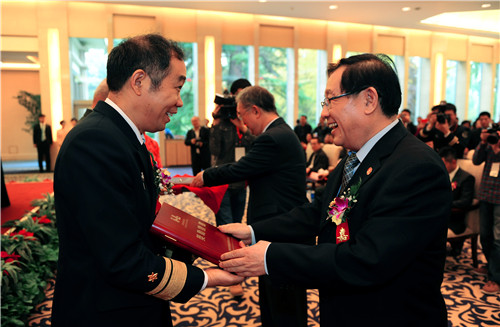 全国政协副主席、科技部部长万钢为马伟明颁奖。