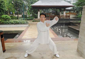 接受记者采访时,涂方祥刚忙完工作,西装革履,戴着眼镜,让人难以相信他就是刚刚拿到国际武术冠军的高手。图为涂方祥在展示太极。