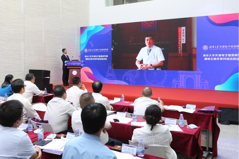 电子院常务副院长王瀚晟向与会嘉宾详细介绍了电子院五年来的建设成果。五年来,清华电子院已建成一套完整的科技创新体系,始终坚持以党建工作为引领,以制度创新、人才培养、平台建设为基础,以市场为导向,以资本为支撑,促进科研技术应用,服务天津经济发展。截至2020年7月,清华电子院共挖掘科创性项目115个,已通过论证项目71个,注册成立公司40个,目前已孵化一批诸如深鉴科技、湃方科技、华慧芯科技等新一代信息技术领军企业,为区域经济发展增添了创新活力。