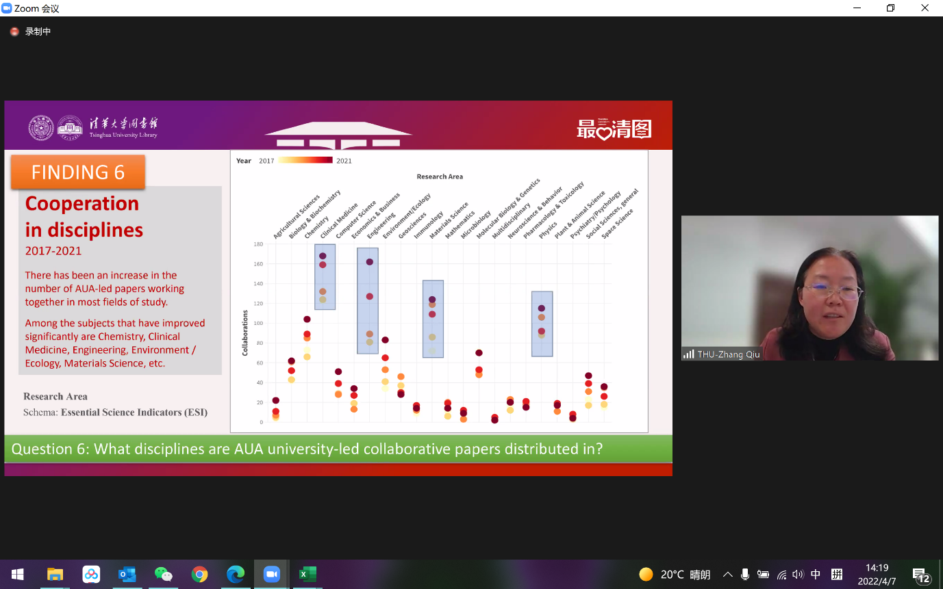 乐鱼在线平台图书馆副馆长张秋以“基于文献计量方法的亚洲大学联盟国际学术合作论文分析”为题作专题报告。她介绍,亚洲大学联盟成立五年来,联盟不同成员高校间学者合作发表论文数量增长率较联盟成立前有显著提高,联盟15所成员大学间国际合作论文的影响力明显高于本校论文的整体影响力;同时,从学科来看,联盟各大学之间在大部分学科领域的国际合作都有较大提升。