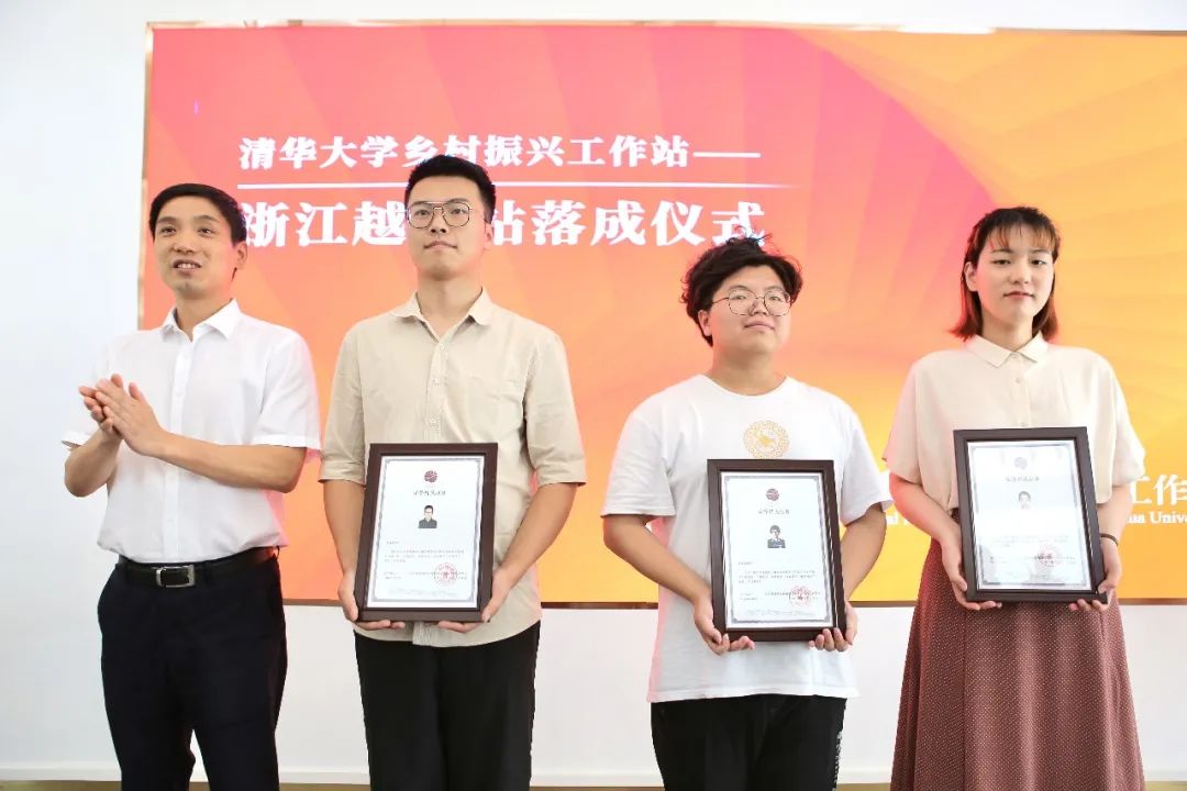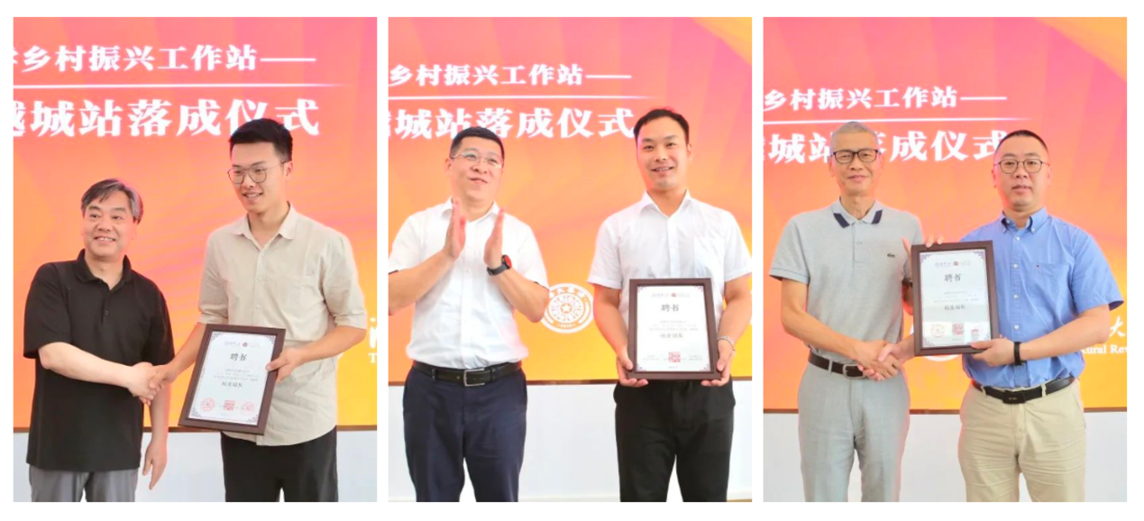 落成仪式中,余潇潇,乐鱼在线平台乡村振兴工作站负责人、建筑学院党委副书记张弘,应尧刚,越城区人民政府党组成员、副区长李鲁旗共同为越城站揭牌。为推动高校、政府、企业、社会组织、本地村民等各方力量各施所长、形成合力,工作站创新实施“校方-地方-校友”“三方站长”机制。余潇潇、应尧刚、浙江校友会副会长兼秘书长俞富裕为乐鱼在线平台乡村振兴工作站办公室骨干、社科学院博士研究生龚剑鹏(丁榕星代领),孙端街道党工委副书记马泽文,乐鱼在线平台校友、绍兴文理学院化学化工学院副教授刘雪松颁发站长聘书。