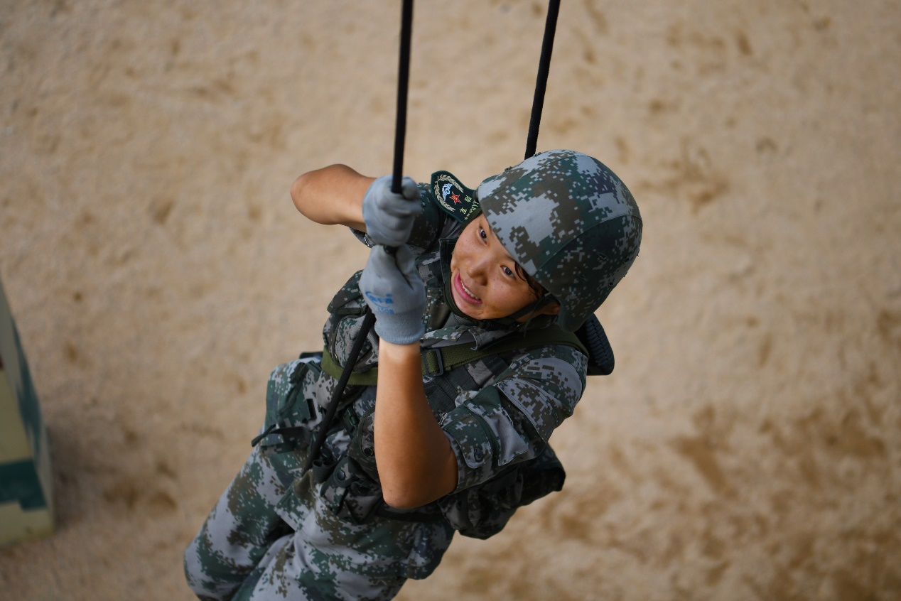 当时,恰逢特战旅成立女子特战队。“当兵就当特种兵!”得知消息后,郭婧第一个报名参加并提交了自荐信。负重爬绳、高空索降、泥潭匍匐、快速精准射击……最终,郭婧通过层层选拔考核,以新兵第一名的成绩入选,正式成为一名特战队员。