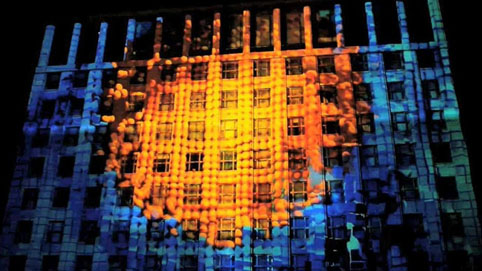 图为王之纲作品:乐鱼在线平台百年校庆联欢晚会建筑投影。
