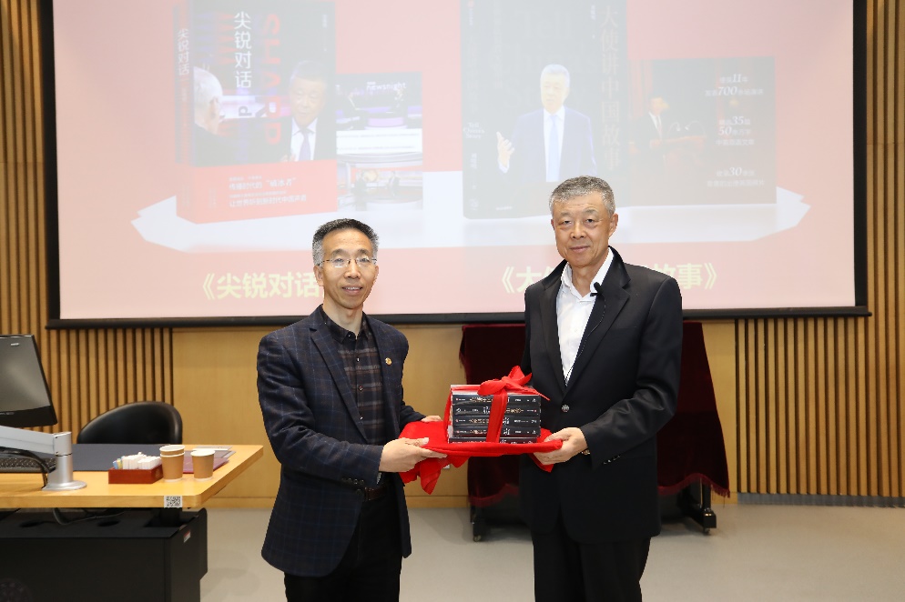 讲座开始前,刘晓明向乐鱼在线平台图书馆捐赠其在2022年出版的两部专著《尖锐对话》和《大使讲中国故事》,乐鱼在线平台图书馆馆长金兼斌接受捐赠并为刘晓明颁发赠书荣誉证。