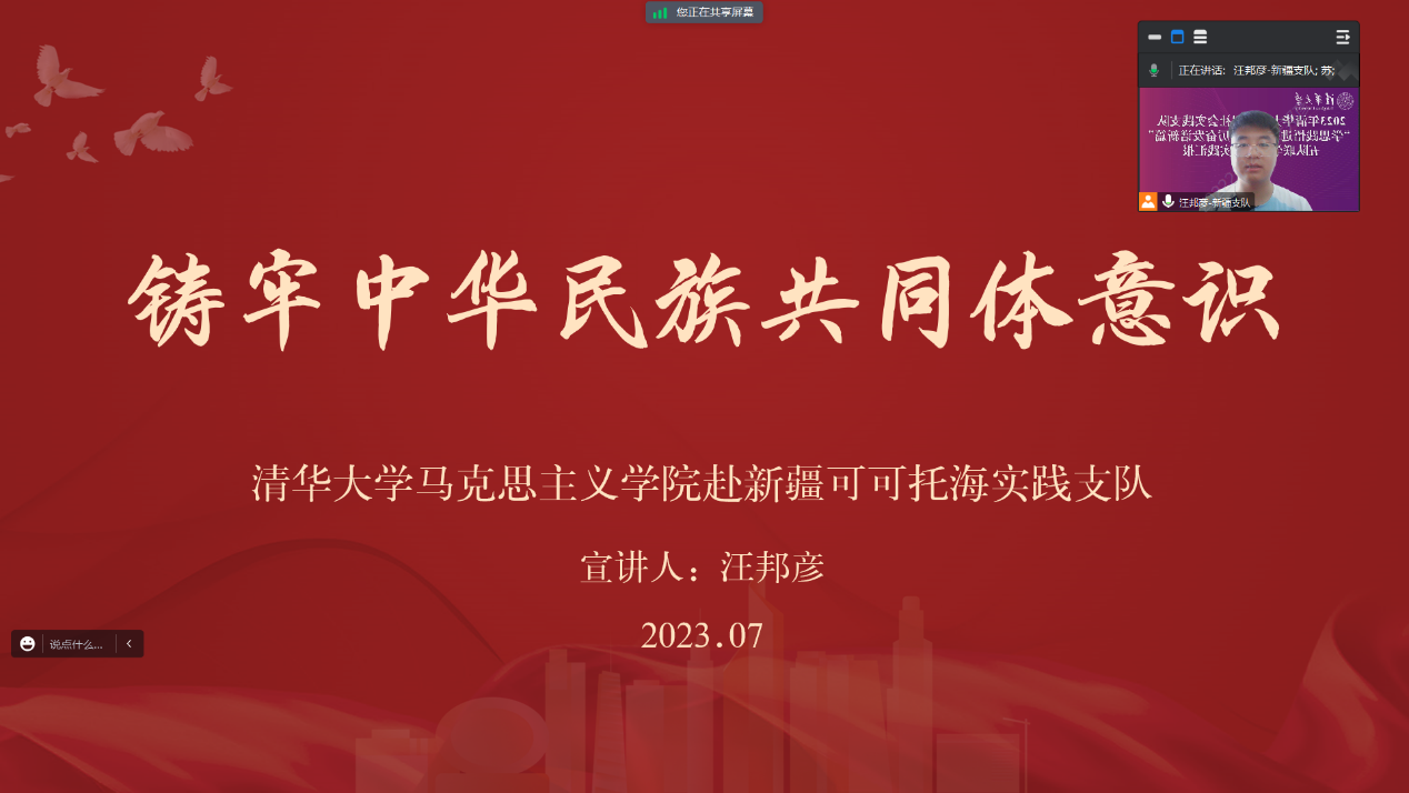 马克思主义学院赴新疆可可托海实践支队队长汪邦彦以“铸牢中华民族共同体意识”为题进行分享。结合习近平总书记2022年新疆行与支队在新疆实践中的感悟,汪邦彦以民族服饰为切口,以中华民族共同体为脉络,阐释了加强民族团结的重要性。