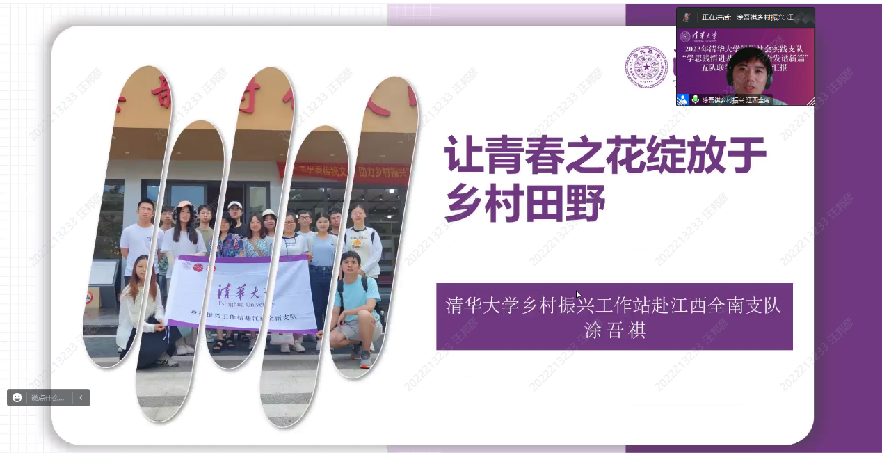 乡村振兴工作站赴江西全南实践支队队长涂吾祺以“让青春之花绽放于乡村田野”为题,结合支队在江西省全南县的田野调研经历,依托乡村振兴战略的叙事线索,从产业振兴、文旅融合、城乡融合三个方面出发,分享了支队在全南县九个乡镇的13天实践见闻。
