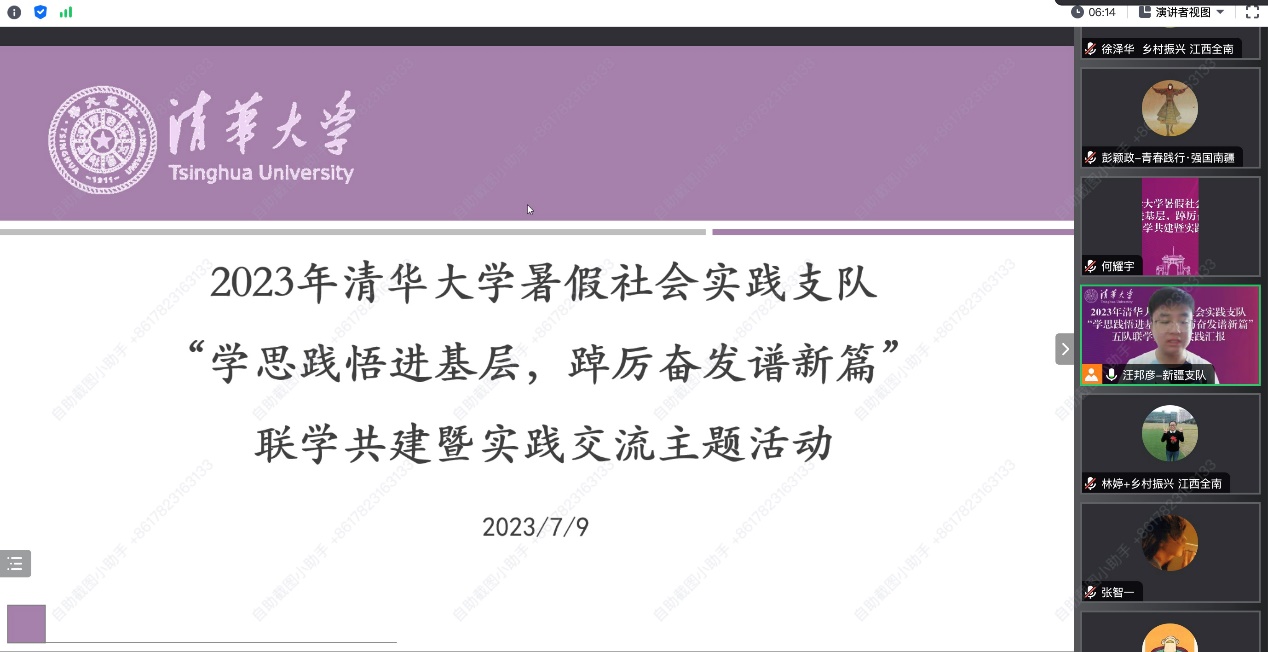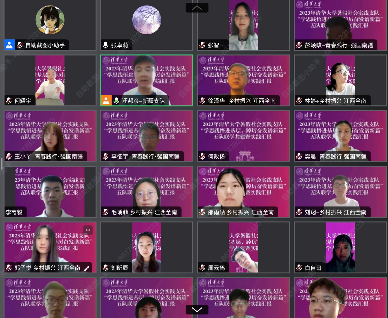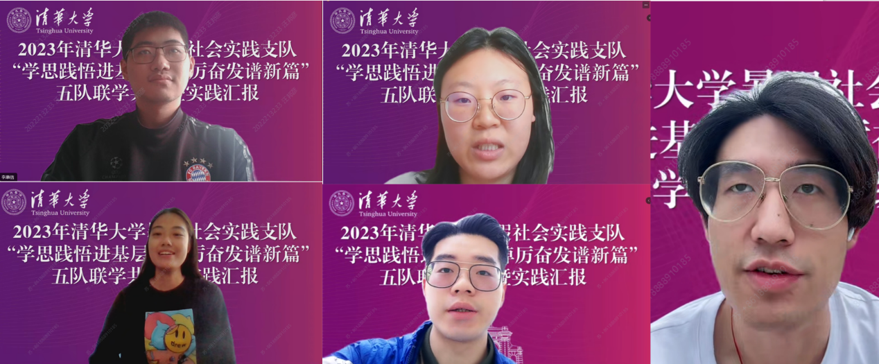 五队同学共同围绕清华学子与社会实践话题开展热议。西藏日喀则支队李康信、广西联合支队何佩熹、江西全南支队毛瑀菲、新疆可可托海支队周云鹤和山东支队董腾云结合自身经历分享了实践感想。