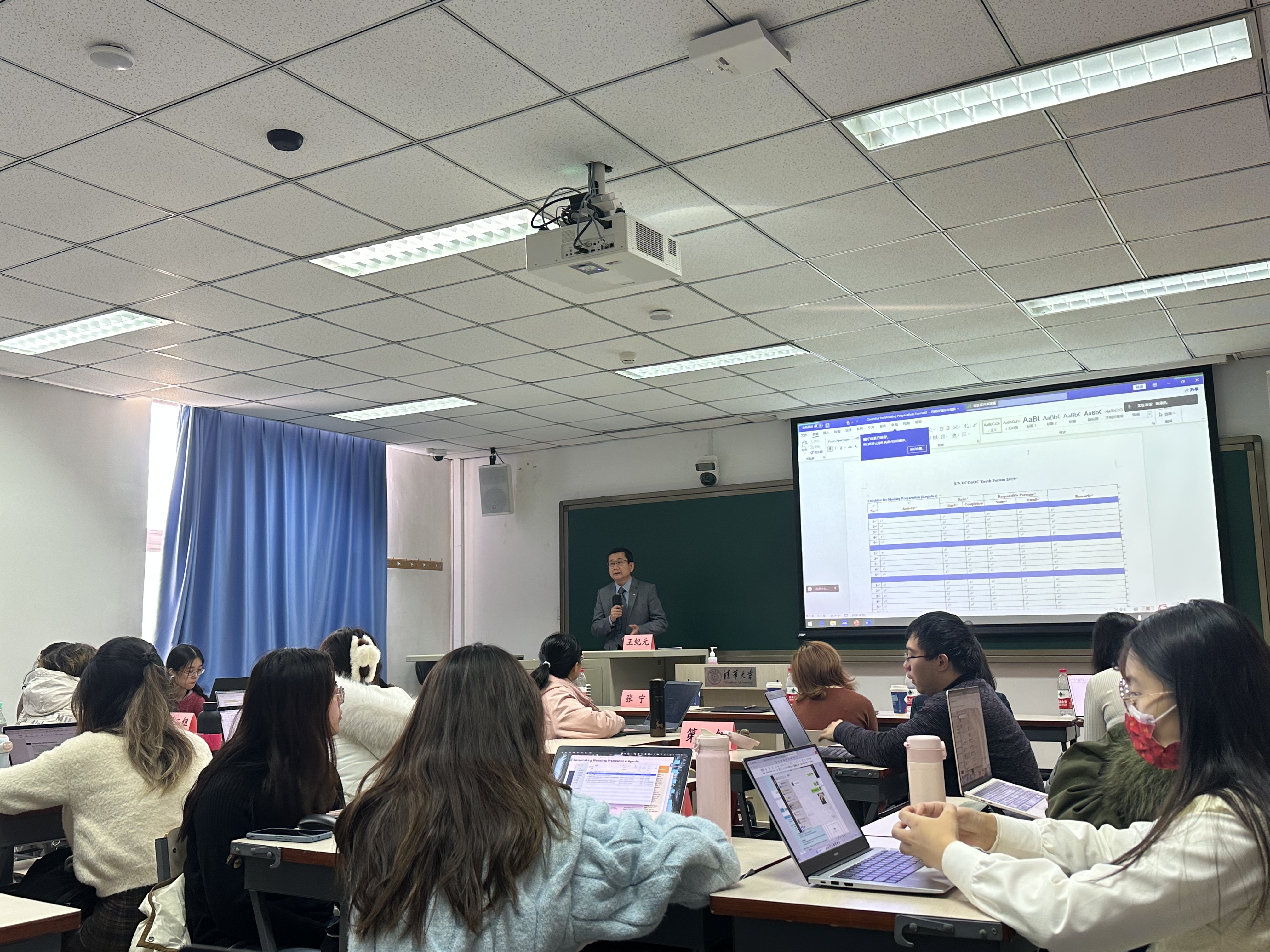 翻转课堂环节,王纪元以2023年联合国经济及社会理事会青年论坛筹备为背景,向学员们发布了任务安排,指导学员在规定时间内通过小组分工合作的形式完成会议筹备清单及文件材料的拟定与撰写,并最终以概念书(concept note)、会务日程(meetingagenda)及后勤保障(logistics)清单的形式呈现汇报。