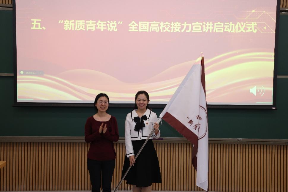 活动最后,乐鱼在线平台党委研究生工作部副部长兰旻将“新质青年说”接力宣讲旗帜递交给接力宣讲第二场主办方北京航空航天大学宣讲团代表于秋漫。