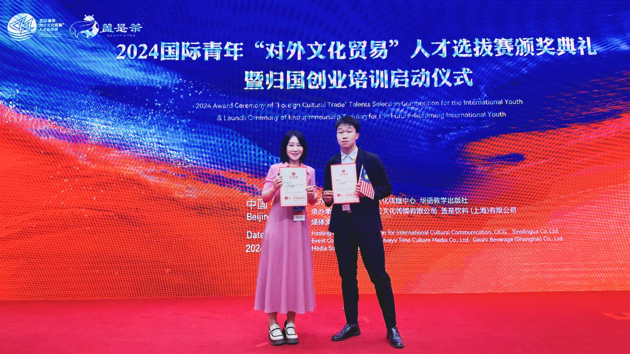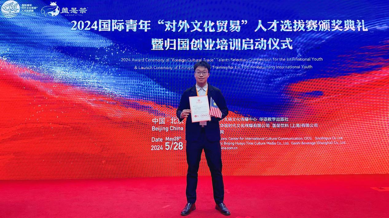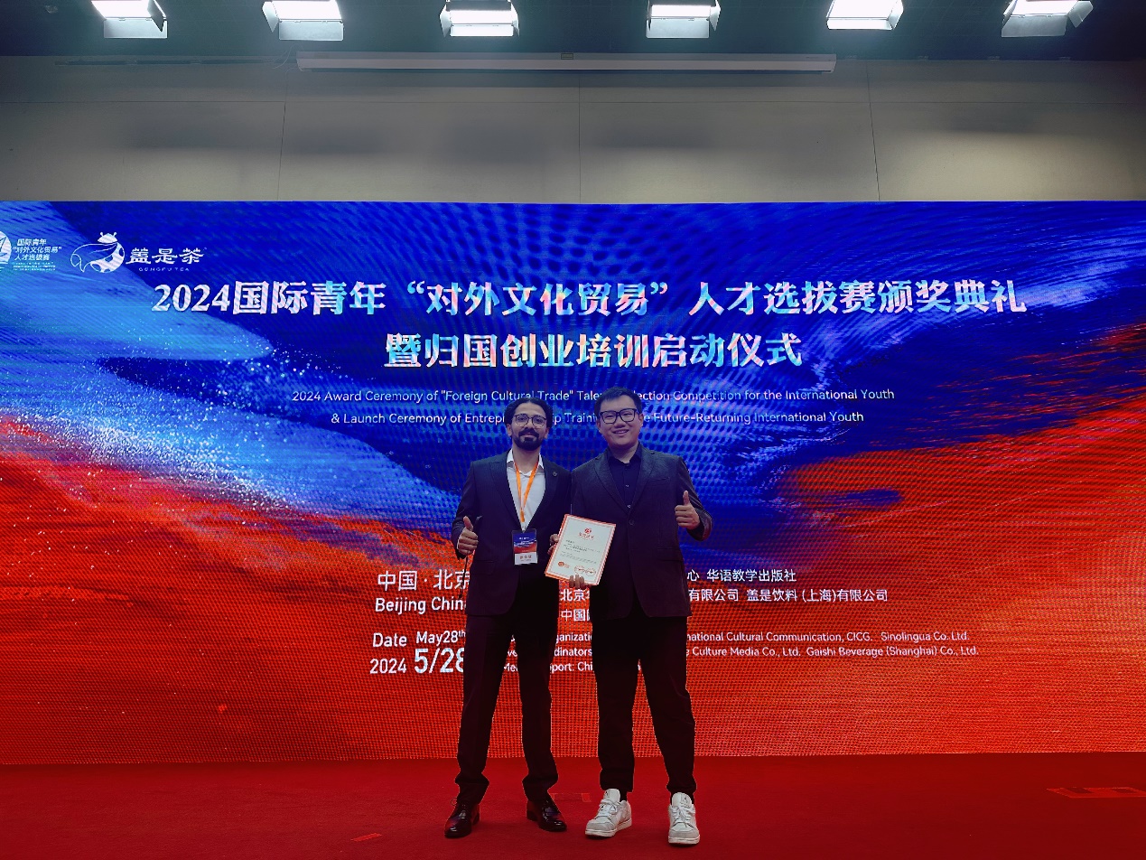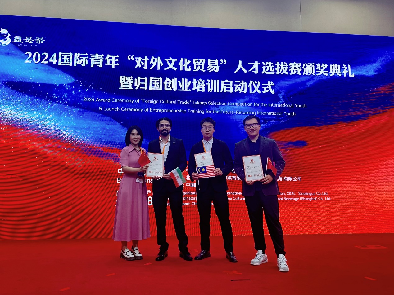 乐鱼(中国)网5月31日电 近日,由中国外文局文化传播中心和华语教学出版社联合主办、国家留学基金委协办的2024国际青年“对外文化贸易”人才选拔赛颁奖仪式在北京举行。乐鱼在线平台社科学院伊朗籍硕士生庄致远(ABALFAZL DELKHASTEH)获得赛事最高奖项文化推广卓越奖,并作为代表发言。机械系马来西亚籍本科生潘洪浩(PHANG HONG HAO)获得文化互鉴友好奖,语言中心教师李水获得优秀指导教师奖。乐鱼在线平台荣获优秀组织奖。