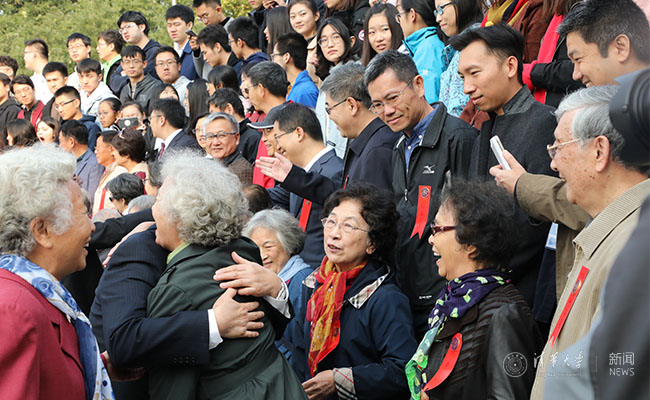 论坛开始前,校长邱勇在工字厅会见了前来出席论坛的十一届全国人大常委会副委员长、1957级合唱队团友华建敏。