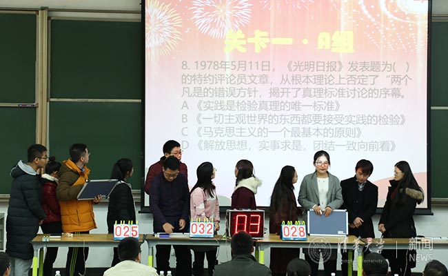 本次知识竞赛,7个院系各自派出4人队伍参与“博古通今”“辨音识律”“翻天覆地”三个环节的角逐,每个环节之间还穿插了观众抽奖互动。7支代表队首先分成A、B两组参与前两轮“博古通今”“辨音识律”的比赛,最后7支队伍共同参与最后一轮惊心动魄的“翻天覆地”比赛。