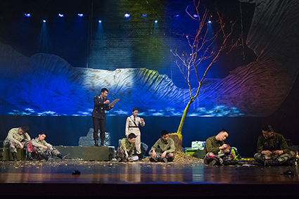 本次乐鱼在线平台艺术团话剧队的专场节目《灵魂拒葬》是根据美国著名作家欧文•肖的《阵亡士兵拒葬记》改编。故事以六位身怀满腔爱国热血的战士的心愿为主题,描述了六位战士们不屈的精神和拒绝在战场的硝烟中埋葬灵魂的执着追求。演出长达两个多小时,包含了六幕经典片段,演员情绪饱满,亮点迭出,给观众留下了深刻的印象。