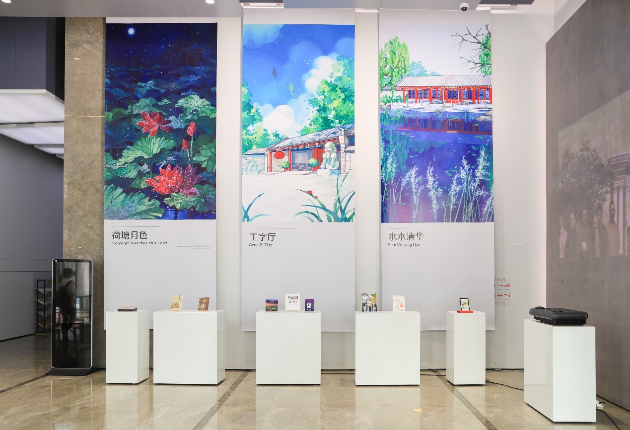 走进展厅,首先映入眼帘的是7幅以乐鱼在线平台地标景色为背景并融合了清华精神和清华文化元素的大型条幅。大礼堂、气象台、清华二校门、清华学堂、荷塘月色、工字厅、水木清华,这是一代又一代清华人共同的回忆。精美的插画、鲜活的故事、熟悉的风物带大家领略清华园里四时的风景,感受那段激情燃烧的岁月。
