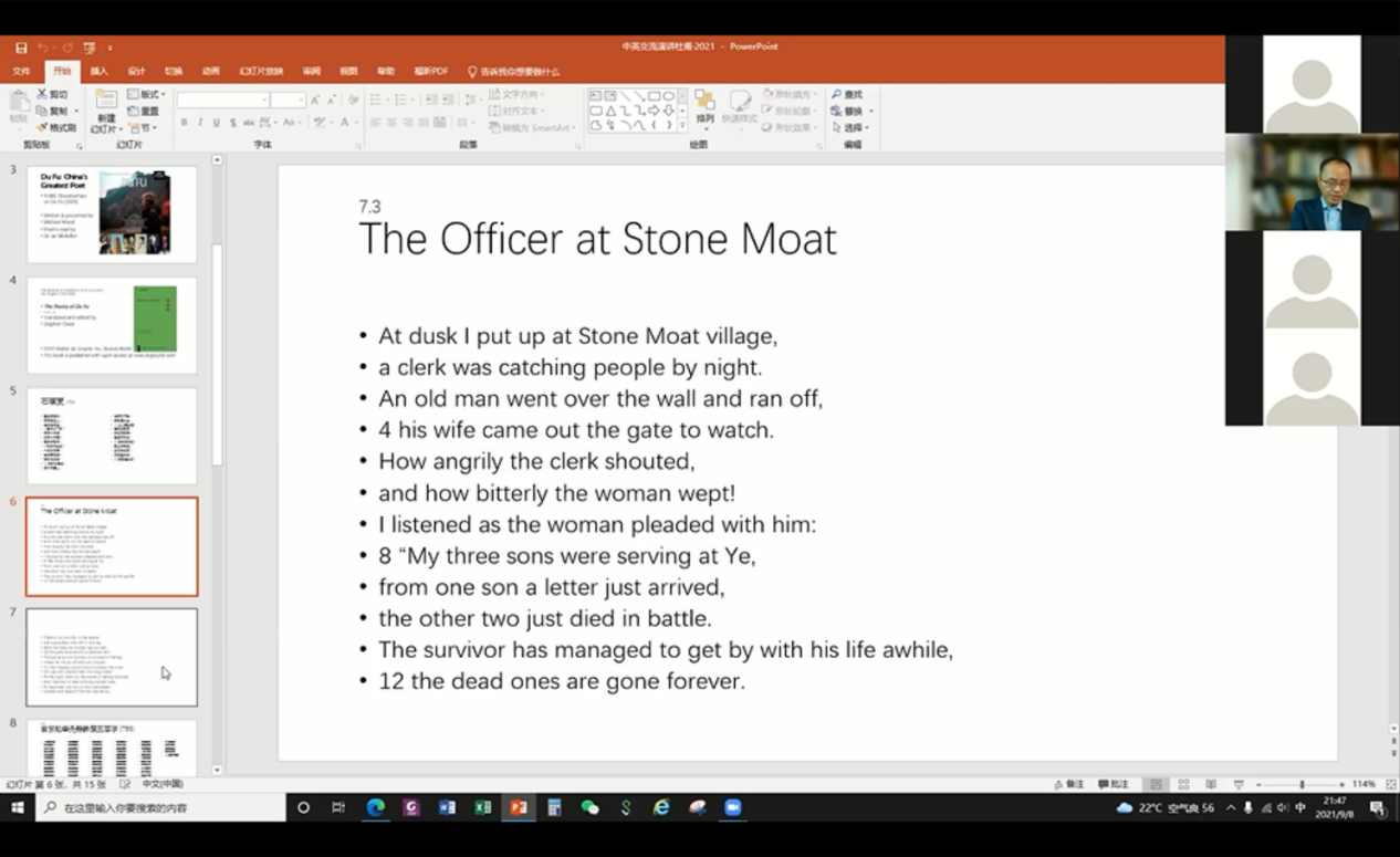 晚21:00,乐鱼在线平台外国语言文学系教授余石屹以“杜甫对底层人民的同情:一个发展的视角”(An Evolutionary Perspective on Du Fu as a Great Poet of Sympathy for the Down-trodden)为题,分享了BBC纪录片《杜甫:中国最伟大的诗人》以及哈佛大学汉学家宇文所安(Stephen Owen)的杜甫诗作译本。以《石壕吏》和《自京赴奉先縣詠懷五百字》为例,通过翻译带领青年学生们感受不同的诗学传统及其不同的文化和价值在文学中所留下的痕迹。