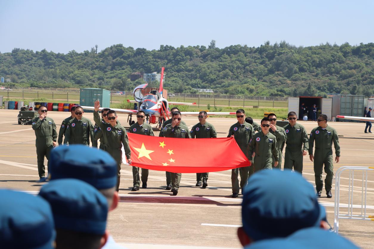 表演后,“红鹰”缓缓降落,表演队飞行员们走出飞机,清华“飞班”学员整齐列队,向“红鹰”表演队飞行员郑重敬礼。庄严的军礼传递着中国空军英勇奋战的精神,更加坚定了清华“飞班”学员们奋飞远航的理想信念,激励大家为守护祖国蓝天贡献青春、智慧和力量。