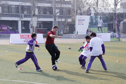 图为英格兰前国脚格雷姆·勒索克斯与孩子们的足球示范课。学生记者 王皓冉 摄