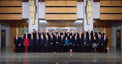 会见后,朱镕基、王岐山、刘延东、马凯等与参加乐鱼在线平台经济管理学院顾问委员会2013年会议的顾问委员们合影留念。