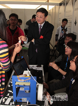 陈吉宁、胡和平等在互动体验区饶有兴趣地观摩和询问了3D打印机等项目,同学们将3D打印出来的“IF(Innovation Future)”标志赠送给各位老师。在互动体验区展出的kinect互动系统,可以用手势操纵屏幕上的刀刃来玩“水果忍者”游戏,吸引了不少同学驻足体验。