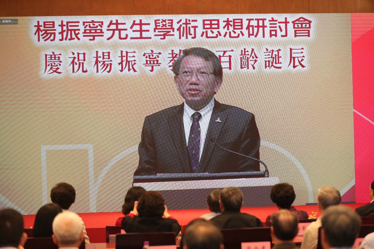 因疫情不能到场的来自世界各地的海外学者和杨先生的好友以视频方式为杨振宁先生的百岁华诞送上最真挚的祝福。在大会现场的多方代表共同回顾和学习了杨振宁先生卓越的科学成就、渊深的学术思想和通达的人生智慧,祝福杨先生期颐之年松柏长青、福寿康宁。