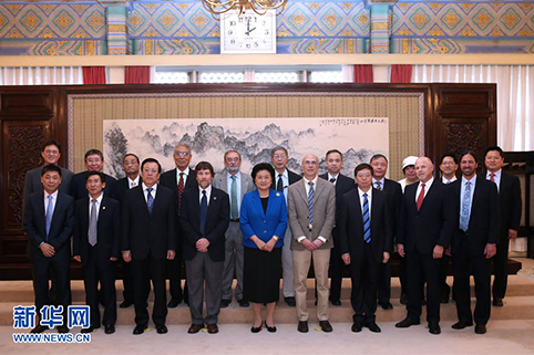 中国国务院副总理刘延东14日下午在中南海紫光阁会见了来华出席2015年国际磁学大会的国际电机电子工程师学会磁学协会主席布鲁斯·特里斯一行。