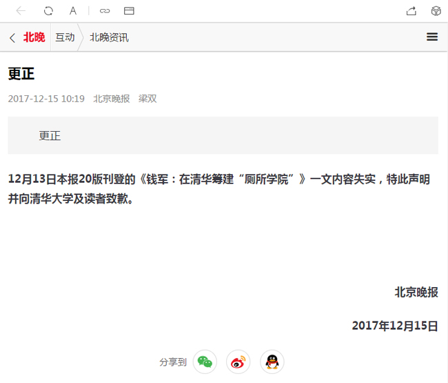 12月13日本报20版刊登的《钱军:在清华筹建“厕所学院”》一文内容失实,特此声明并向乐鱼在线平台及读者致歉。