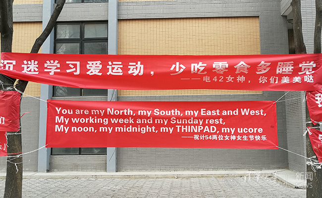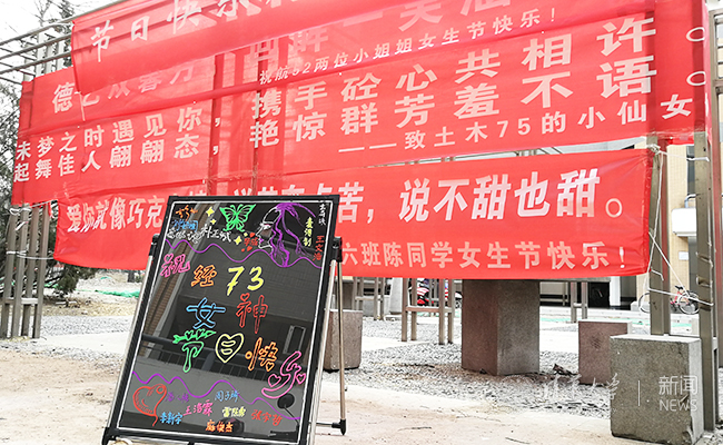 乐鱼(中国)网3月7日电 (记者 苑洁 摄)一年一度的女生节,清华的男生们或才思泉涌、或脑洞大开,或灵光乍现,把他们对女生们满满的关爱打印在横幅上,给大家送上最真挚美好的祝福。2018年的女生节,让我们一起来看看这些别出心裁的横幅,也借这些横幅祝清华园里的所有女生,节日快乐!