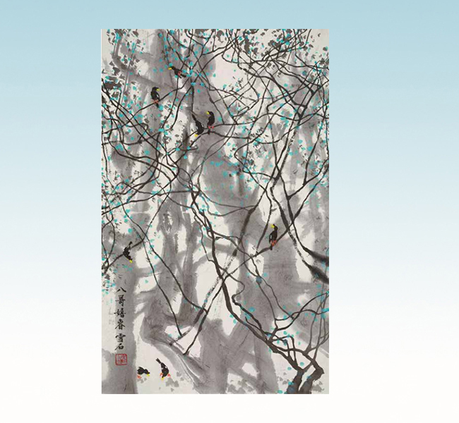 ▲ 白雪石《八哥嬉春》纸本水墨设色。 44cm×27cm 1980 年
