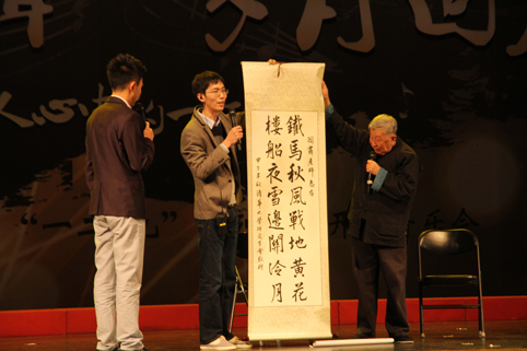 研究生代表、校研究生会主席吴锦鹏向阎肃赠送书法作品《风花雪月》