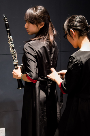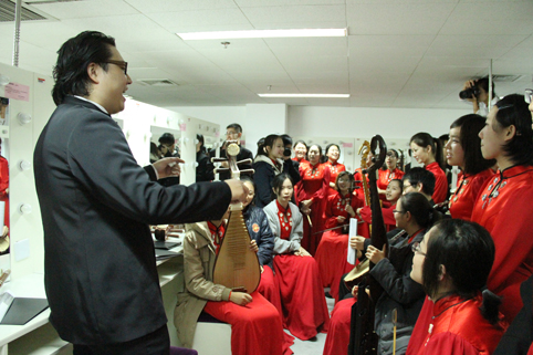 民乐队的同学们在化妆间内齐唱参赛曲目《踏歌》。周睿 摄