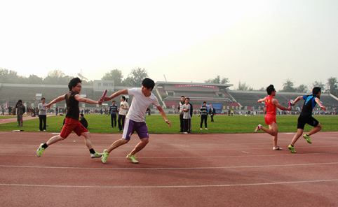 图为10乘60迎面接力比赛运动员交接棒瞬间。