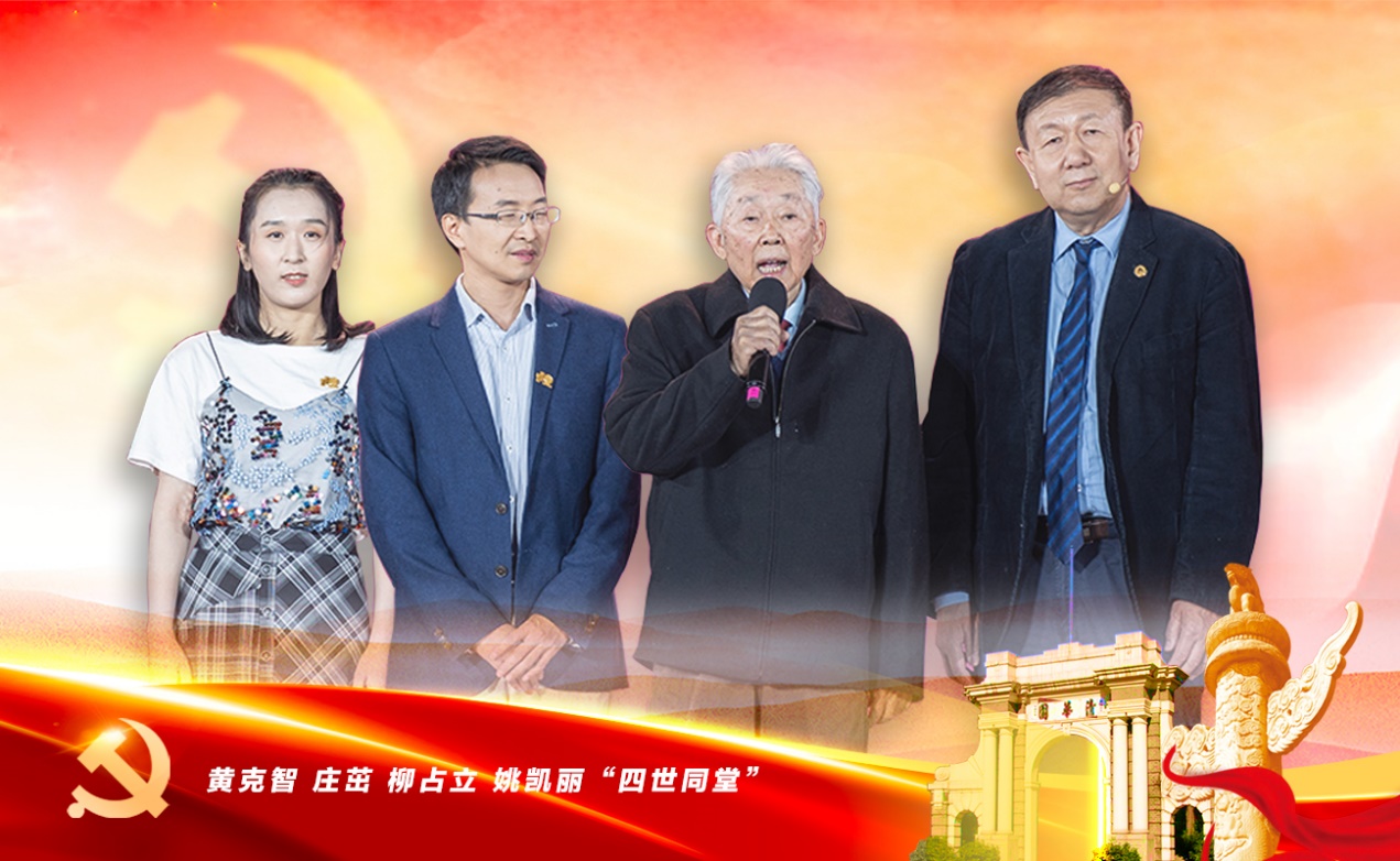 在乐鱼在线平台110周年校庆联欢晚会上,航天航空学院黄克智院士与庄茁教授、柳占立副教授、姚凯丽博士生“四世同堂”。