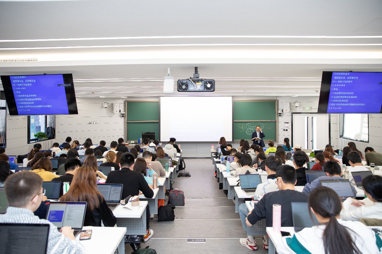 今年秋季学期,张明楷给法学院大二学生开设专业必修课“刑法总论”。课堂上,他会用一些有趣的小段子和风趣的话语引导同学们思考问题。“我们一般都把张明楷老师‘捧上天’,除了因为他是刑法界的泰斗之外,主要是他上课挺风趣幽默的,会用很多比较易懂的例子。”法学院大二的余思彤说。