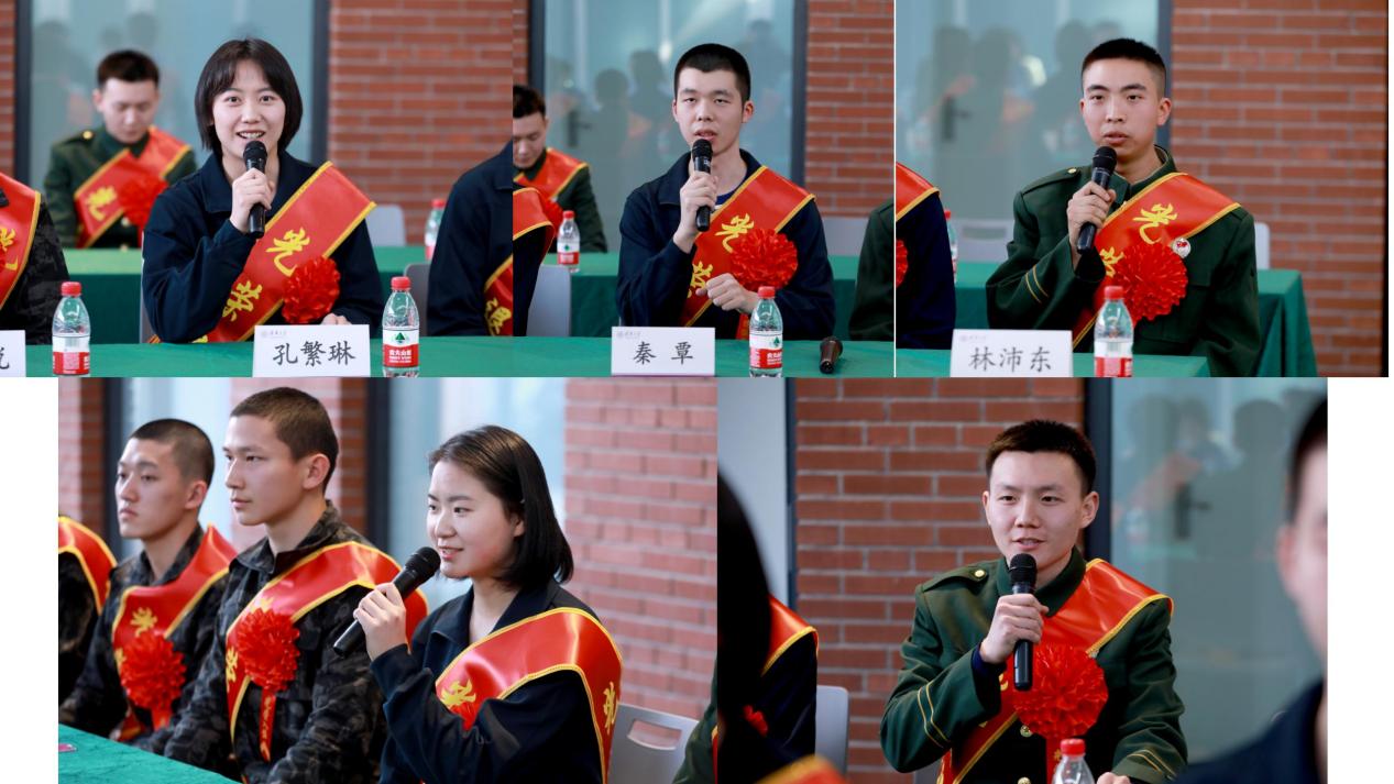 退伍老兵同学代表分享了军营经历和感悟。服役于战略支援部队某部的孔繁琳在平凡的岗位上不断磨砺自身,各项比赛集训勇创佳绩,担负战备值班一丝不苟,用行动诠释清华士兵的坚持;服役于海军某部的秦覃,无论是担负营门警卫和消防应急处突任务,还是到机关协助工作,都能认真履职,做到“零差错”;服役于武警某部的林沛东,勇于挑战自己,坚持锻炼减重25斤,坚持学习习近平总书记重要讲话精神,书写心得体会360多篇,在三尺哨位忠诚值守,将爱国之情、自豪之感融入到每一次站岗执勤当中;服役于陆军某部的姚郗文,不怕吃苦,挑战自我,从体能勉强及格到达到优秀水平,各项工作都完成出色;服役于武警某部的刘浩然,在高强度演习训练中锻造打赢本领,通过亲身经历的故事讲述清华士兵的使命和担当。