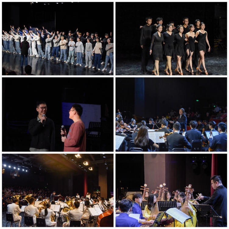 寒训汇报演出上,各队展示了为期一周的训练成果。汇报内容既有《春之颂》《柴可夫斯基e小调第五交响曲》《匈牙利狂想曲第六号》等世界经典作品,也有《庆典序曲》《汉阳门花园》《洪羊洞》《春江花月夜》等民族风格作品,还有原创话剧片段《君子之教》、国标《知道不知道》《千寻的华尔兹》、相声《学聋哑》等校园原创作品,兼具艺术水准、校园风采和时代特色。赵洪、教务处副处长杨帆、学生艺术团工作组组长陈志昊以及各队指导教师共同观看演出。