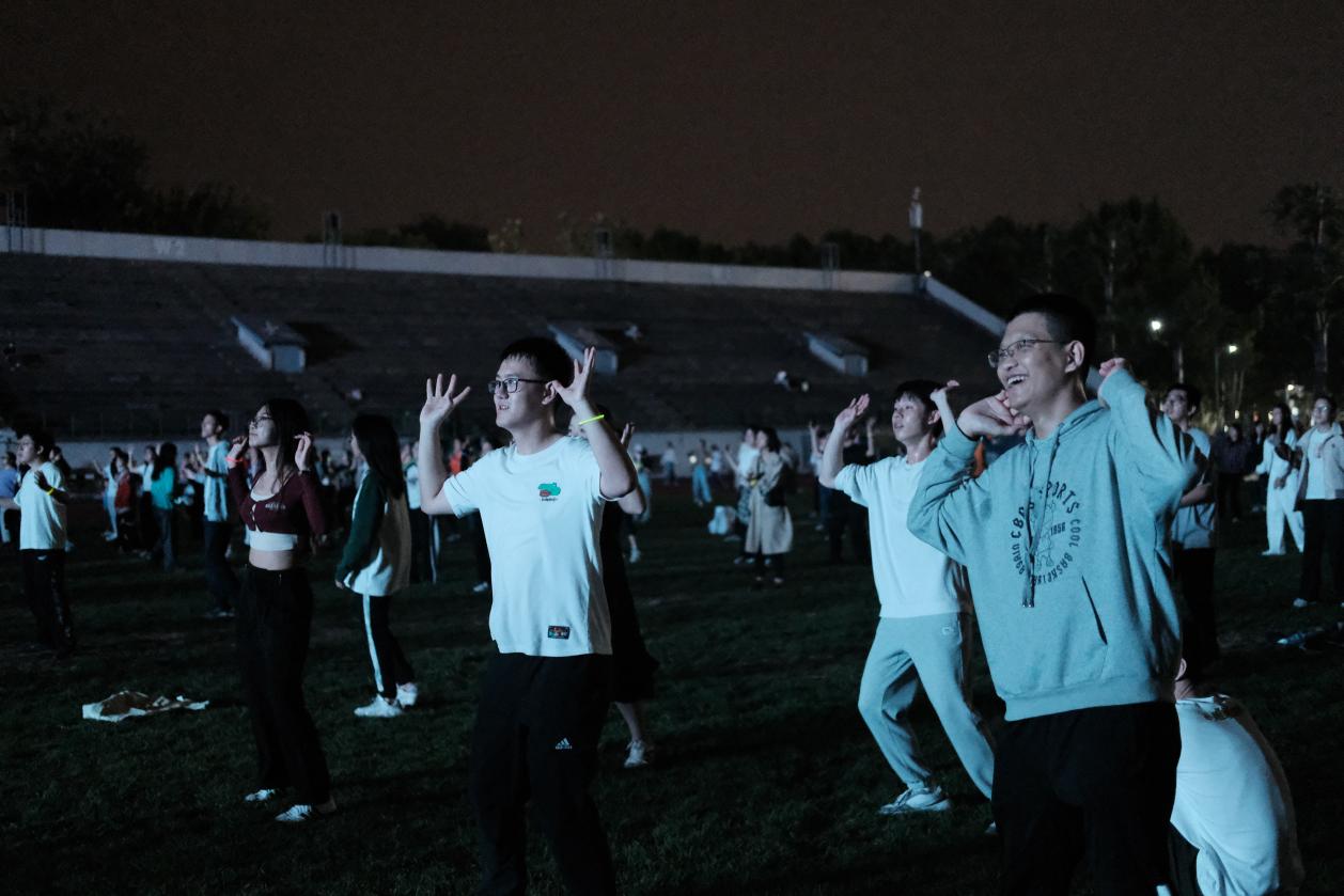 夜幕降临下的东大操场歌声环绕、热闹非凡。同学们换上轻便的运动服装,伴随着音乐的旋律节拍,挥舞双臂、迈开双脚,迸发出无限的活力与激情。或是在塑胶跑道上挥洒汗水,或是在操场中央秀出舞姿,同学们尽情地享受运动带来的乐趣。手腕上佩戴的荧光手环在夜色中勾勒出青春模样。